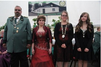 der Proklamation ihr Regentschaftsjahr beenden. Unter musikalischer Begleitung des Schützentrommlercorps Krefeld-Oppum zogen die Schützen, Fahnengruppe, Majestäten und Thronpaare unter dem Beifall der Schützen der befreundeten Vereine ins Festzelt ein. Auf der Bühne, dem Thronpodest, hatten die Majestäten in Reihe auf Stühlen Platz genommen und harten der Dinge die da kommen sollten. Vorsitzende Maren Heinz, unterstützt von ihrem Stellvertreter Horst Strickhausen, nannte die Aktion des Königsschießens mit den Teilnehmern und dem Ausgang. en. Am Himmelfahrtstag startete der Titelkampf, eröffnet durch Bürgermeister Ottmar Fuchs. Vier Anwärter stellten sich dem Kampf um die Königswürde. Stefan Berger, Karl-Heinz Telke, Jürgen Höller und Herbert Müller. Was um 16:15 Uhr begann endete um 19:28 Uhr mit dem 682. Schuß. Stefan Berger hatte es bei seinem dritten Versuch geschafft. Seine Frau Petra wird ihm in seinem Amtsjahr als Königin zur Seite stehen. Der Kronprinzentitel ging an Julia Hassel, die sich den Titel im Kampf mit Michelle Müller sicherte. Bei den jüngsten Schützen und Schützinnen fanden sich vier Anwärter mit Jasmin Müller, Philipp Hahn, Yannick Wachow und André Krämer. Den Titel sicherte sich Jasmin Müller. Zum Zeichen der Würde wurden ihnen die entsprechenden Insignien überreicht.