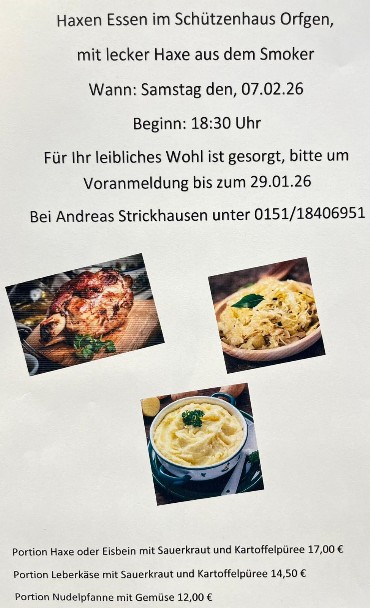 Der KKSV Orfgen veranstaltet am Samstag, den 07.02.2026, ab 18.30 Uhr Haxen essen im Schützenhaus. Die Haxen kommen aus dem Smoker und sind sehr lecker. Dazu gibt es Kartoffelpüree und Sauerkraut. Als Alternative gibt es Leberkäse. Für das leibliche Wohl ist bestens gesorgt. Die Haxen werden frisch zubereitet und sind garantiert saftig und lecker. Das Kartoffelpüree ist cremig und das Sauerkraut würzig.